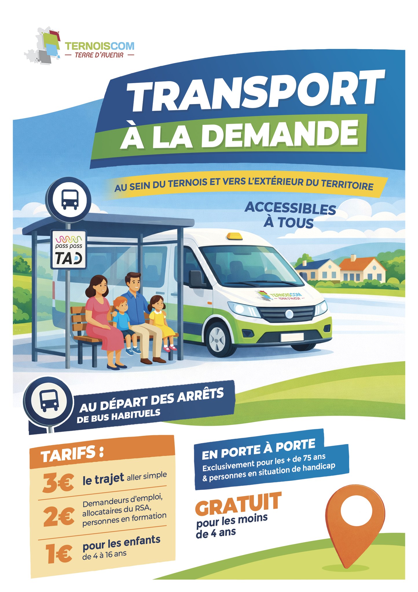 Le service Pass Pass TAD est un service public à la demande de transport routier de personnes avec prise en charge et dépose aux arrêts matérialisés du territoire. Il permet de se déplacer au sein du Ternois et vers l’extérieur du territoire. Un service en porte-à-porte est proposé sous conditions.